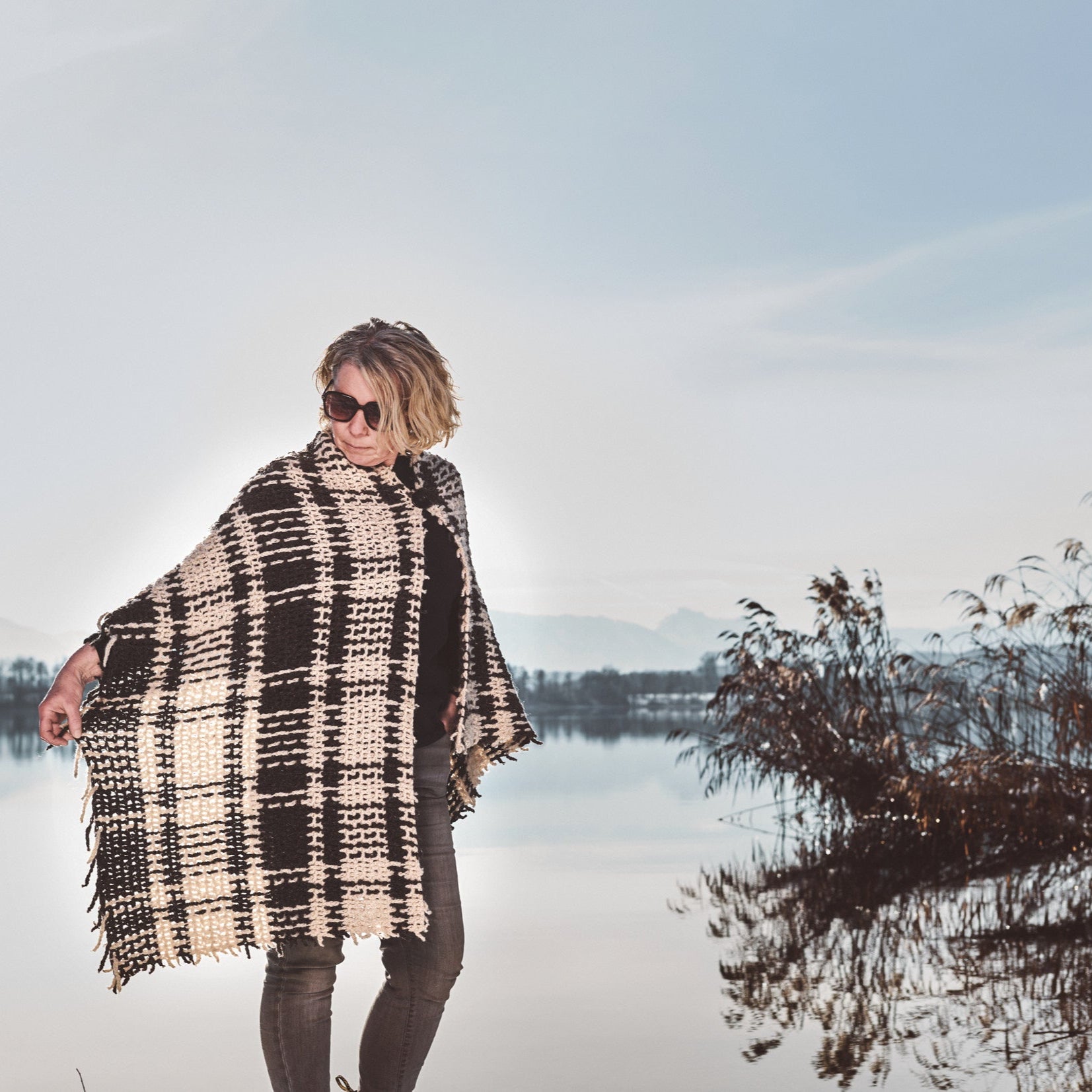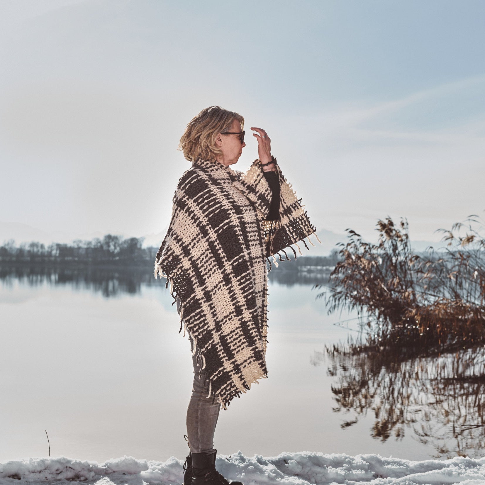 Handwerk in höchster Perfektion. Dieses Schultertuch ist ein absolutes Einzelstück. Reine Schafwolle aus der Region von mir per Hand gesponnen. Die handgesponnene Wolle wurde dann, in einer speziellen Technik aus häkeln und weben, zu diesem wunderschönen Tuch verarbeitet. Dadurch ergibt sich ein herrliches Karomuster. Reine Handarbeit vereint mit feinster Schafwolle. Schafwolle ist: Atmungsaktiv, Feuchtigkeitsregulierend, im Winter warm, im Sommer kühl, Schmutzabweisend ... Länge: 175 cm, Breite: 60 cm